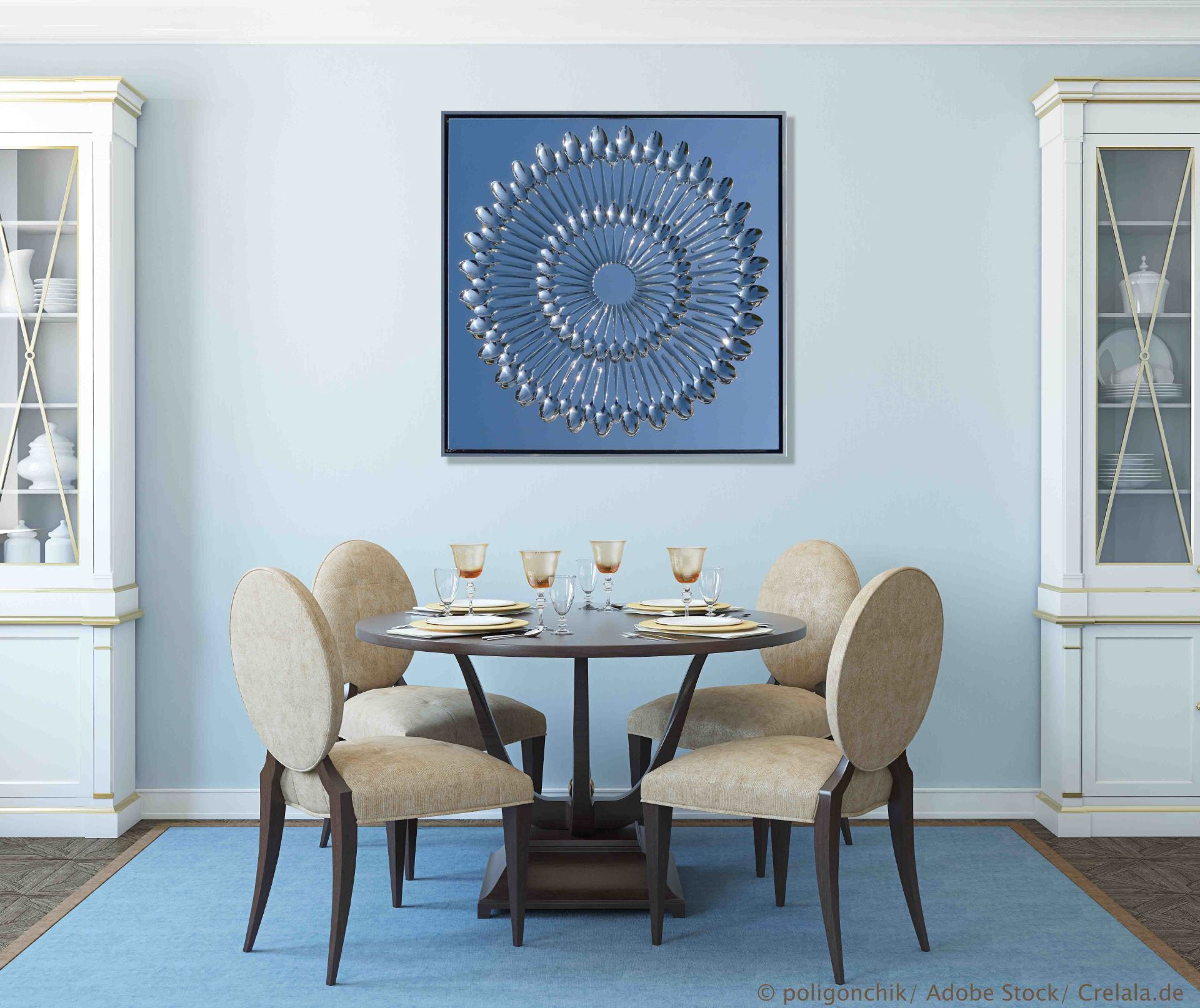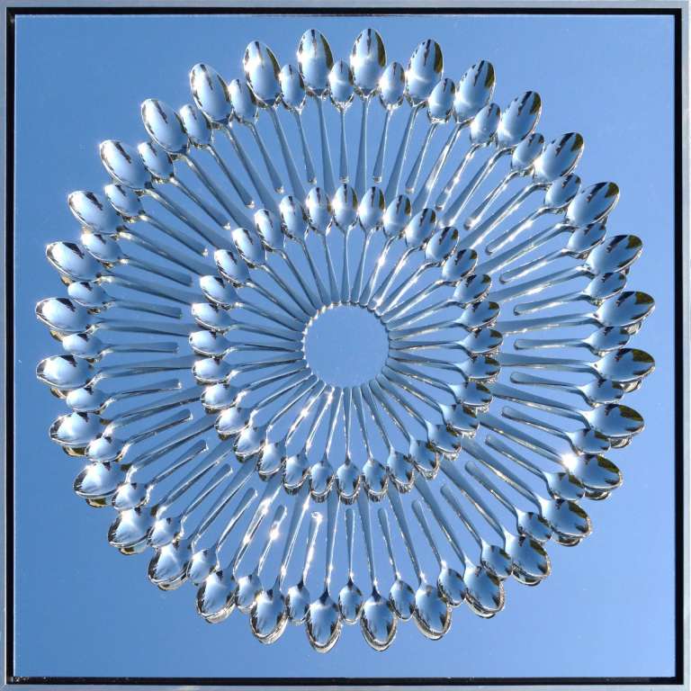 Das Kunstwerk "Perfection" ist eine Assemblage bestehend aus hochwertigen Berndorf Kaffee- und Speiselöffeln auf einem Spiegel. Das Unikat wird gerahmt zum Verkauf angeboten. Das Außenmaß dieses Unikates beträgt 84 cm x 84 cm.